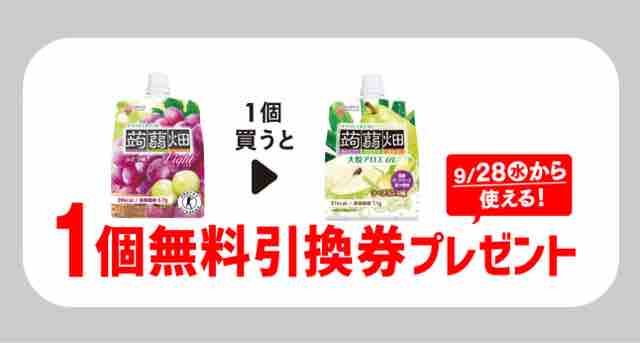 コンビニエンスストアのセブンイレブンで、対象のクラッシュタイプ蒟蒻畑ライトぶどう味を買うとクラッシュタイプ蒟蒻畑大粒アロエラフランスが試せる無料引換券がもらえるキャンペーンが始まっている。