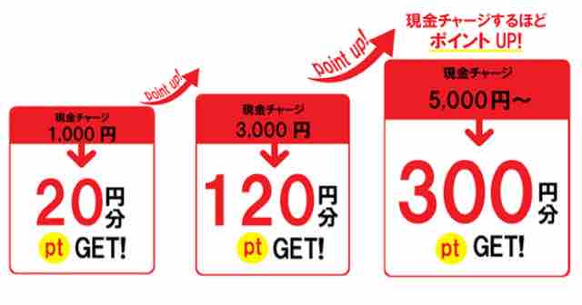 現金チャージはチャージ額が多ければポイント付与率が高い。1,000円単位でチャージすることができるが、チャージ金額1,000円~はポイント付与率1%、チャージ金額3,000円~はポイント付与率2%、チャージ金額5,000円~はポイント付与率3%になる。