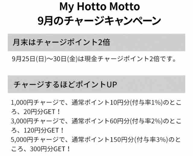 これが毎月の月末はポイント2倍キャンペーンを実施するため、1,000円~2%、3,000円~4%、5,000円~6%と変わってくる。6%となると結構大きい。My Hotto Mottoでチャージをするなら「月末に5,000円以上の金額をチャージ」するのがおススメだ。