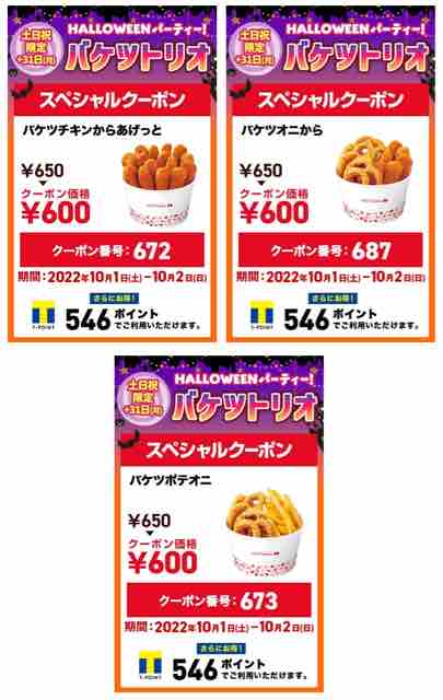 キャンペーンが実施されるのが2022年10月の土日祝日と31日となるので、どこか出かけるときに家族や友達とバケツトリオを食べたいところだ。個人的には値引き額は少ないけど、ポテトがあった方が良いので、バケツポテオニが気になる。