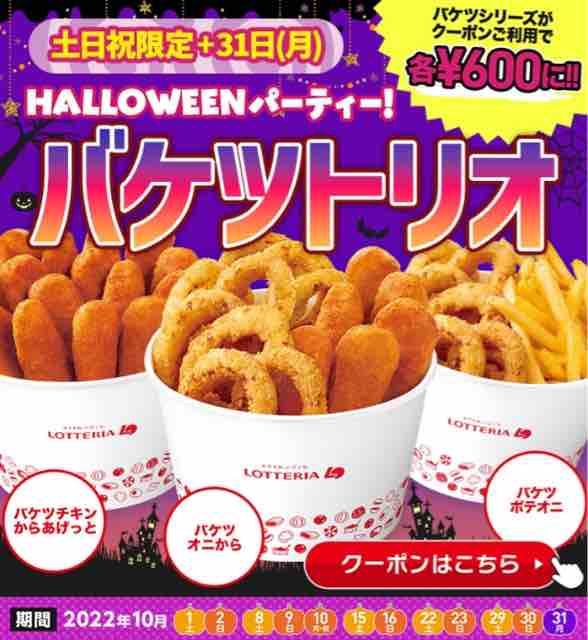 今回は、ロッテリアHALLOWEENパーティーでバケツトリオが600円で販売されるキャンペーンを紹介していきたい。