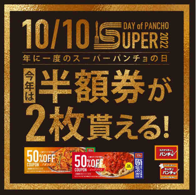 スパゲッティー類が主力商品のパンチョで年に一度の感謝祭として、スーパーパンチョの日2022を実施する。スーパーパンチョの日にスパゲッティー類を注文すると次回使用できるナポリタン&ミートソース50%OFF券×2枚がプレゼントされる。