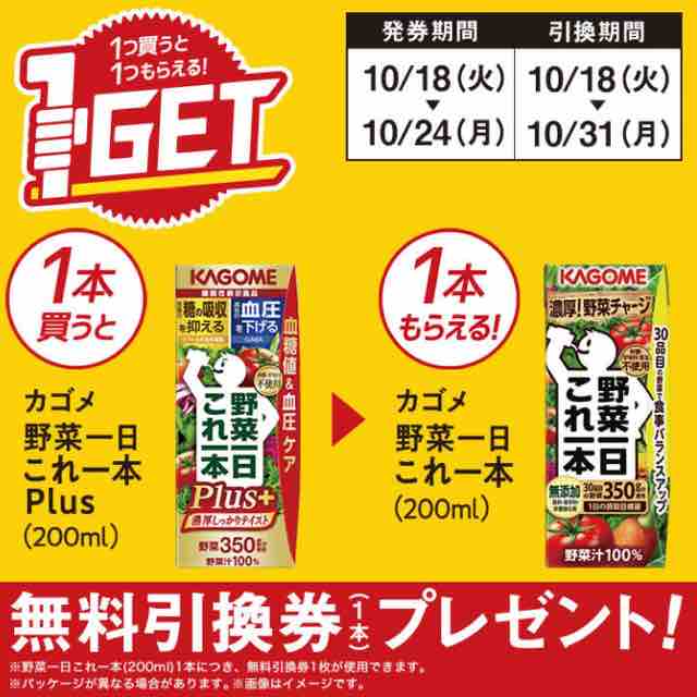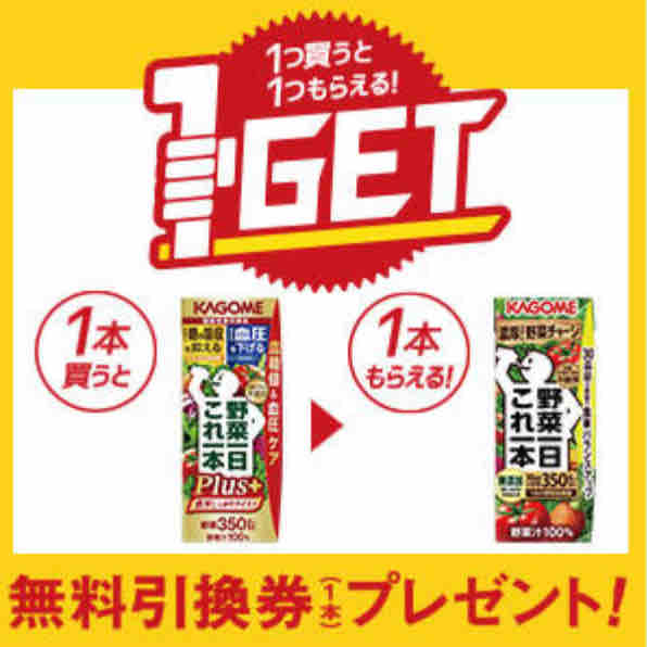 ミニストップで「カゴメ野菜一日これ一本Plus200ml」を1本買うと、「カゴメ 野菜一日これ一本 200ml」の無料引換券が必ずもらえるキャンペーンが始まっている。