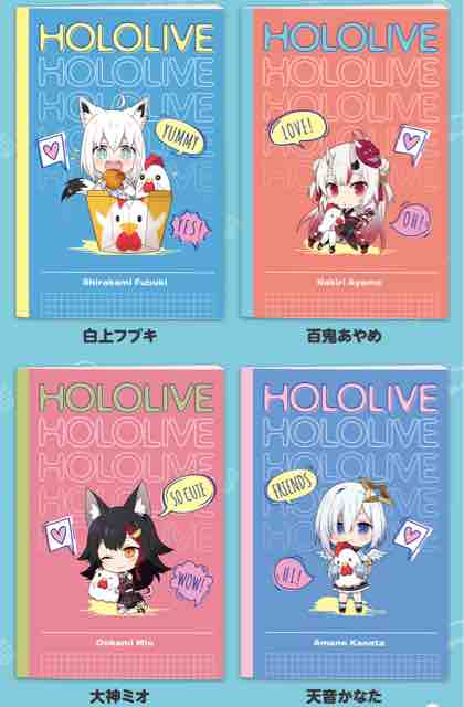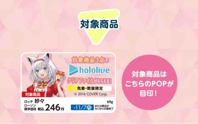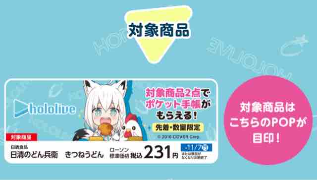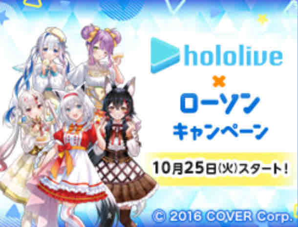 コンビニエンスストアのローソンで、ホロライブのコラボキャンペーンが始まる。キャンペーンは対象商品を買うと、クリアファイル全5種、ポケット手帳全5種、ミニポスター全5種がその場でもらえる。