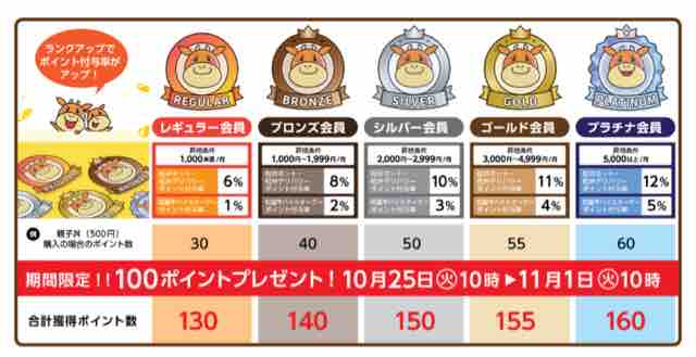 レギュラー会員、ブロンズ会員、シルバー会員、ゴールド会員、プラチナ会員とステージが分かれ、最高のプラチナ会員は昇格条件5,000円以上/月をクリアできれば翌月からなることができるが、松弁ネット・松弁デリバリー・ポイント付与率が12%。松屋モバイルオーダーポイント付与率5%。