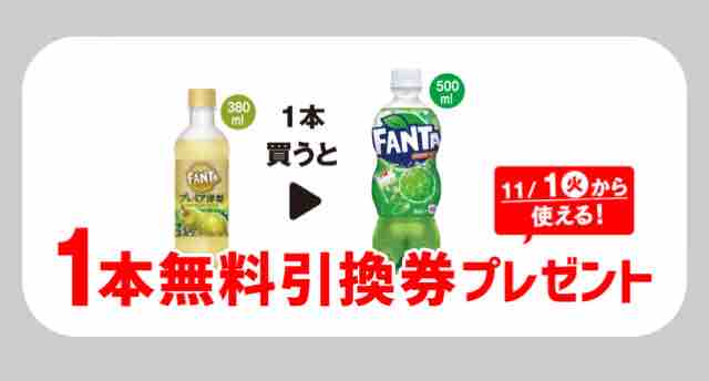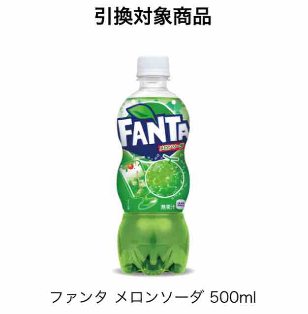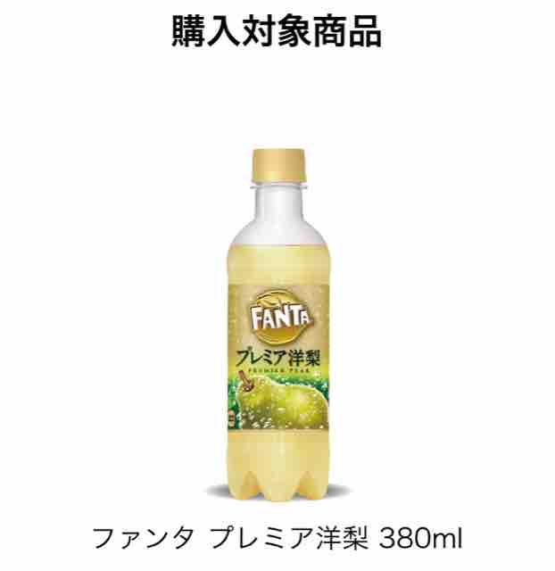 無料引換券がもらえる購入対象商品は、ファンタプレミア洋梨380mlで1本買うと無料引換券がもらえる。もらえる無料引換券の対象商品はファンタメロンソーダ500ml。