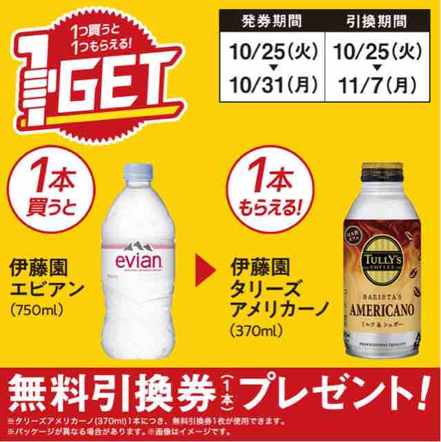 ミニストップで伊藤園エビアン750ml1本買うと、同じ飲料メーカーのタリーズアメリカーノ370mlの無料引換券をもれなくもらえる。無料引換券は、1本ごとに1枚もらえる。1本買うと無料券でもう1本もらえるのでお得だ。