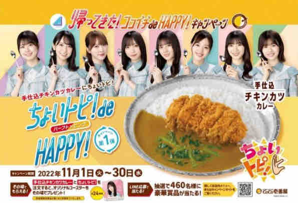 全国のココイチ(カレーハウスCoCo壱番屋)で、日向坂46とのコラボキャンペーンを実施する。3年ぶりのコラボということで、帰ってきた!ココイチ de HAPPYキャンペーンというタイトルでキャンペーンは実施される。