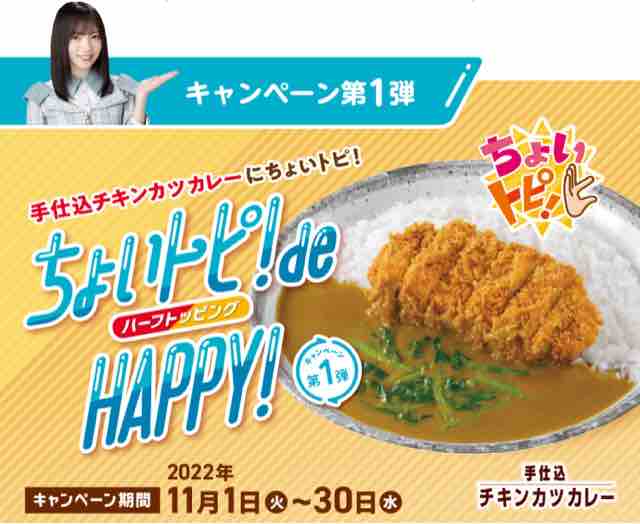 このキャンペーンは第1弾、第2弾、第3弾と期間を分けて実施される。今回は第1弾。手仕込みチキンカツカレーとちょいトピを注文すると、日向坂46メンバーのオリジナルコースターがその場でもらえる。また、抽選で当たるキャンペーンも実施する。