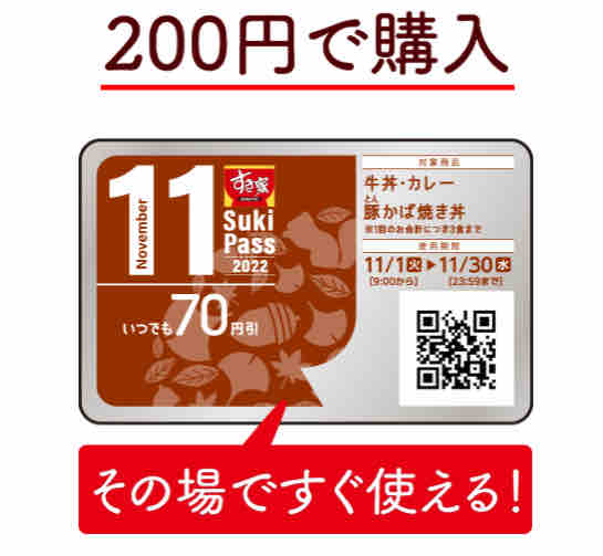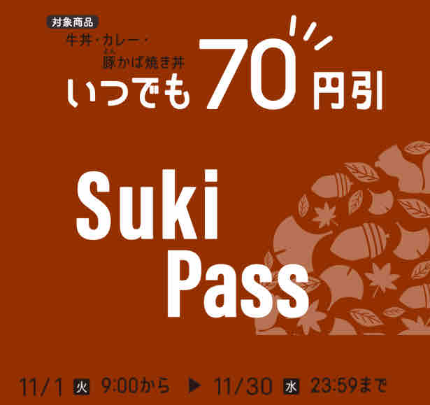 11月Sukipassが2022年11月1日(火)9:00から税込200円で販売開始となる。使用期間は11月中の1ヶ月間。Sukipassを会計時に提示すると牛丼・カレー・豚かば焼き丼が1商品につき70円引きで、店内・持ち帰りどちらでも利用可となる。1会計につき、合計3商品まで値引きされ、家族や友人と一緒に使用することもできる。Sukipassは毎日使用しても良い。
