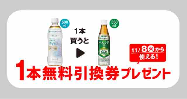無料引換券がもらえる購入対象商品は、ヘルシアMyリズムブレンド茶500mlで1本買うと無料引換券がもらえる。もらえる無料引換券の対象商品はヘルシア緑茶350ml。