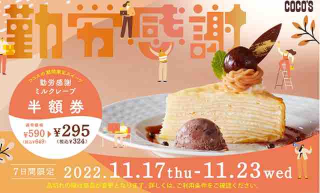 勤労感謝の日にちなんで期間限定の勤労感謝ミルクレープがココウェブで半額で提供されるキャンペーン。ココスでは期間限定スイーツが半額で提供されるのが恒例だ。お得で楽しめるスイーツ。この期間でしか味わえないスイーツを楽しみたいところだ。