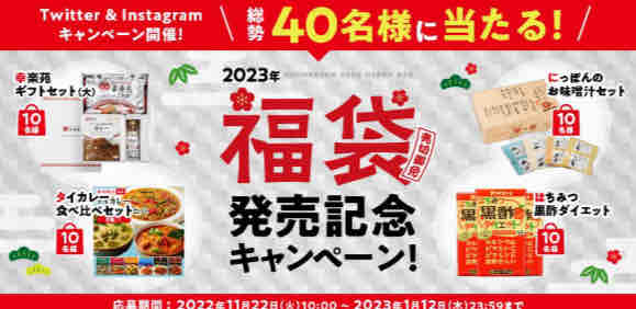幸楽苑では福袋販売記念としてTwitter&Instagramキャンペーンも実施する。合計40名にギフトセット等が当たる。幸楽苑アカウントをフォローして、Twitterであれば該当ツイートをリツイートで応募完了、Instagramであればキャンペーン該当投稿にいいねで応募完了する。