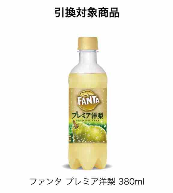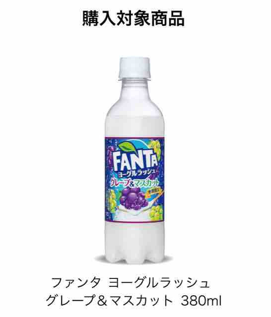 無料引換券がもらえる購入対象商品は、ファンタヨーグルラッシュグレープ&マスカット380mlで1本買うと無料引換券がもらえる。もらえる無料引換券の対象商品はファンタプレミア洋梨380ml。