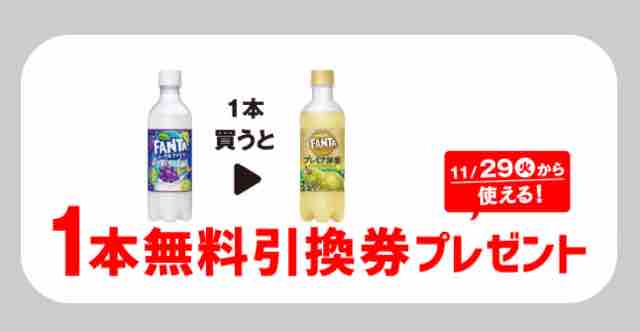 セブンイレブンでファンタヨーグルラッシュグレープ&マスカット380mlを1本買うと、ファンタプレミア洋梨380mlの無料引換券をもれなくもらえる。無料引換券は、1本ごとに1枚もらえる。1本買うと無料券でもう1本もらえるのでお得だ。