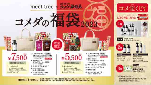 2023年のコメダ珈琲店福袋は人と地球にやさしい福袋をコンセプトにしており、岐阜県発祥のボタニカルコスメブランド「meet tree」オリジナルデザイングッズが入っているのが特徴だ。100年続く老舗木材会社から生まれたコスメブランドのグッズとなる。