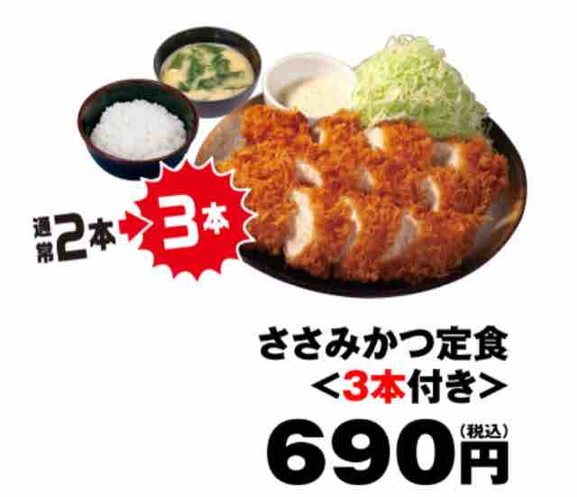 ささみかつかつを使った定食でささみかつが1本増量されて提供されるキャンペーン。ささみかつ1本が増えて満足度もUP。食べるなら店内で食べたい。定食ライスおかわり無料だし、店内で食べればみそ汁も付いてくる。いっぱい食べたい方はライスをおかわりしよう。