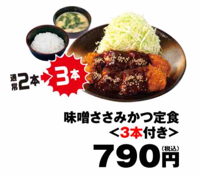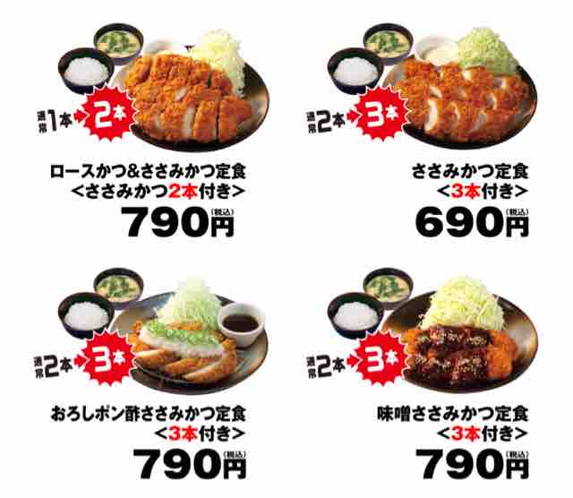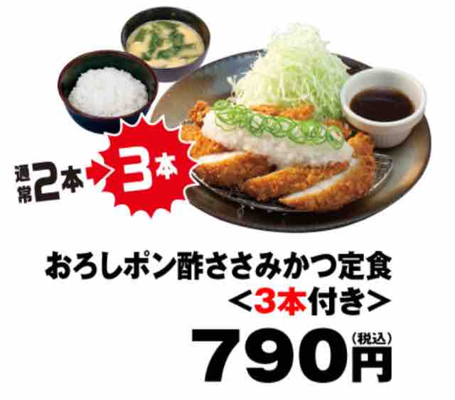 ささみかつとタルタル、味噌、おろしポン酢それぞれの相性は抜群。お得に美味しいささみかつを食べたいところだ。おろしポン酢ささみかつ定食や味噌ささみかつ定食などのささみかつが1本増量して更に ボリューム満点になるキャンペーンとなる。
