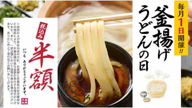 讃岐うどんの丸亀製麺で、毎月一日に釜揚げうどん全サイズが半額になる釜揚げうどんの日を実施している。この釜揚げうどんの日は毎月一日の一回のみ実施されているが、釜揚げうどんをお得に食べることができるので、店内が混み合うほどの人気だ。