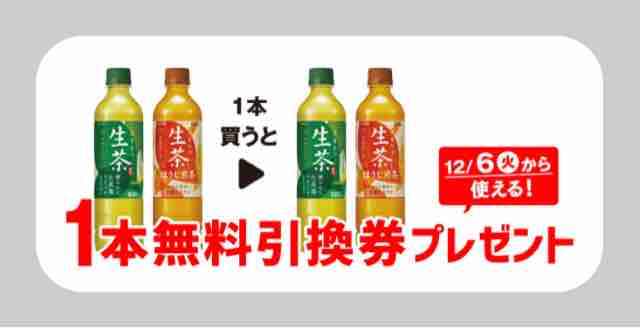 セブンイレブンでキリン生茶600mlまたはほうじ煎茶600mlいずれか1本買うと、同商品いずれか1本無料引換券をもれなくもらえる。無料引換券は、1本ごとに1枚もらえる。1本買うと無料券でもう1本もらえるのでお得だ。