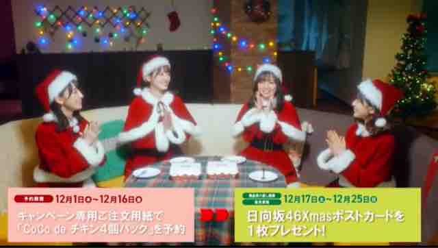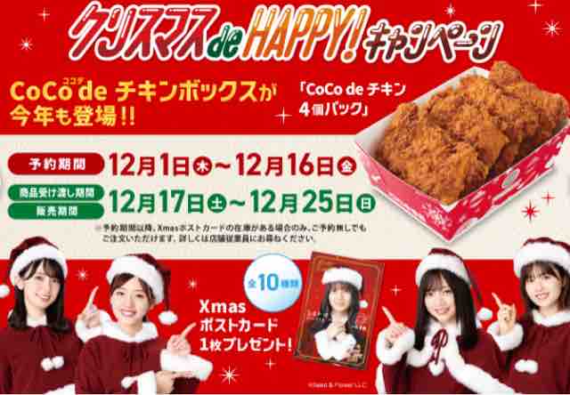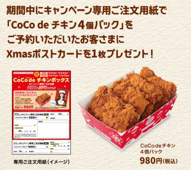 期間中にキャンペーン専用注文用紙でCoCo de チキン4個パック980円(税込)を予約した方に日向坂46メンバーのXmasポストカード全10種のうち1枚がその場でもらえる。また、抽選で当たるキャンペーンにも参加できる。