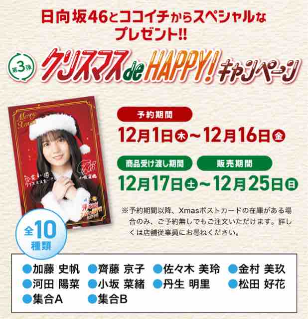 今回、ココイチと日向坂46のコラボキャンぺーン第3弾では、日向坂46メンバーのXmasポストカード全10種のうち1枚がもらえる。日向坂46メンバーのXmasポストカードは、キャンペーン専用注文用紙でCoCo de チキン4個パック980円(税込)を予約すると商品受け渡しの際にその場でプレゼントされる。予約期間以降もXmasポストカードの在庫があれば予約なしでも注文できる。Xmasポストカードの種類は選ぶことができない。
