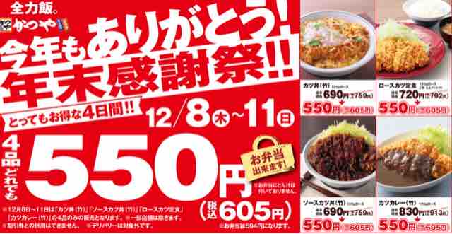 年末感謝祭では、人気の定番メニュー「カツ丼(竹)」「ソースカツ丼(竹)」「ロースカツ定食」「カツカレー(竹)」の4品が通常価格より値引きされてどれでも550円(税込605円)となる。今回はかつやの年末感謝祭を紹介していきたい。