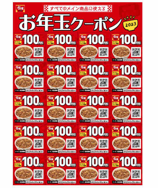 お年玉クーポンとして100円分が計20枚2,000円相当入っており、1会計につきメイン商品(牛丼/その他丼/カレー/定食/朝食/お子様/鍋定食)1点につき、1枚まで利用可能。テイクアウトでも利用可能。家族や友人と一緒に店内で食事をお得に食べることができる。但し、クーポンの利用期限が2022年12月27日(火)~2023年6月30日(金)と指定されているため、忘れずに期限内に使おう。すき家の様々なメニューを味わってもらい、来店機会を作る狙いがありそうだ。