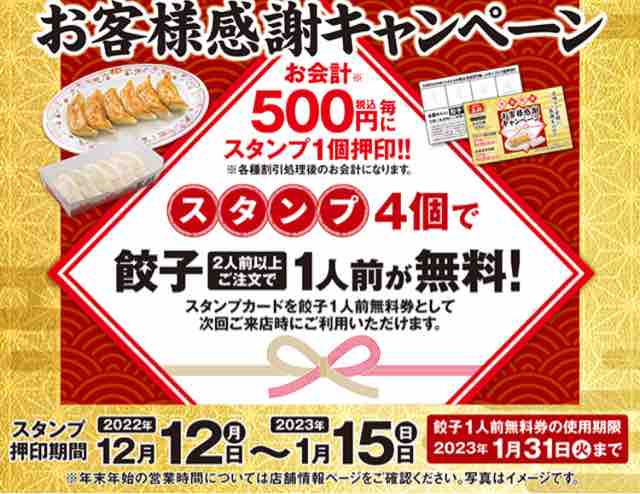 中華料理チェーン店の餃子の王将で、日頃のご愛顧に感謝を込めて年末年始お客様感謝キャンペーンを実施する。スタンプカードが配布されて各種割引処理後のお会計金額税込500円毎にスタンプを1個押印し、4個集めると餃子無料券がもらえ、次回来店時に餃子2人前以上注文で1人前(6ヶ)無料券として次回来店時に利用できる。