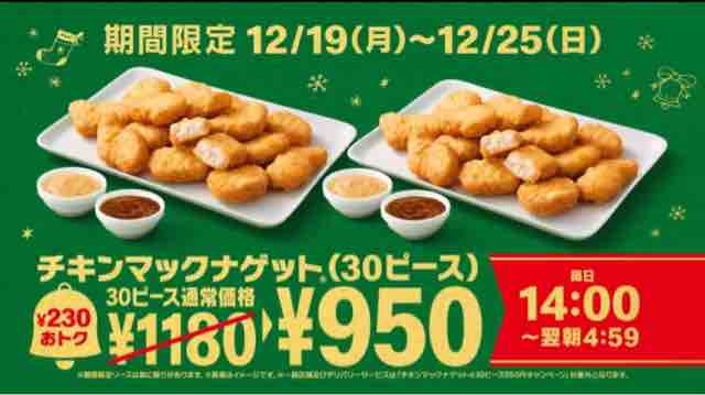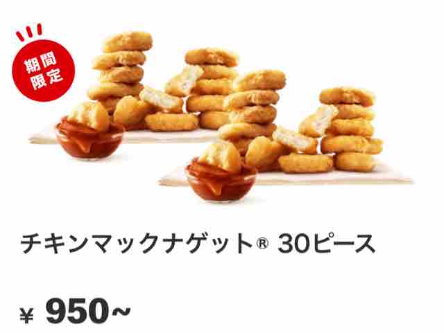 今回はマクドナルドのチキンマックナゲット30ピース(ソース6個付き)を特別価格税込950円のお得な価格で販売するキャンペーンを紹介した。気になる方はマクドナルドへ行ってみてはいかがでしょうか。