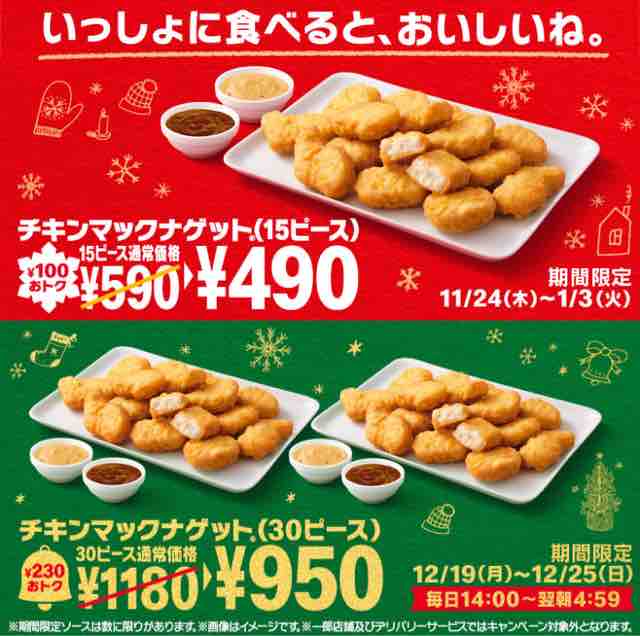 チキンマックナゲットが特別価格になるセールは定期的に実施する。子供から大人まで幅広い層に大人気のチキンマックナゲットがお得に食べることができる。このチャンスを、多くの人が待ってましたとばかりに喜ぶ。去年もゴールデンウィークや夏休み、年末に楽しめるようにセールが実施されたが、今年年末年始に合わせてセールは実施する。