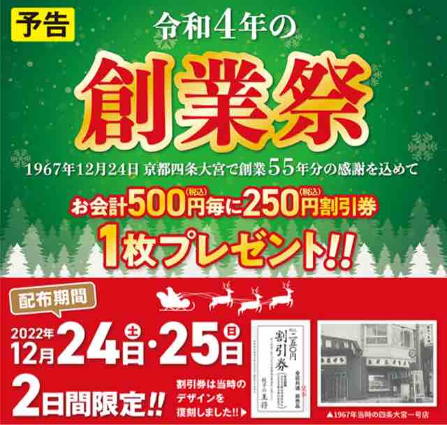 ・創業祭は各種割引処理後のお会計金額税込500円毎に税込250円割引券が1枚プレゼント