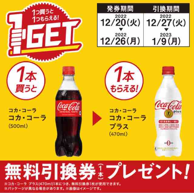 「コカ・コーラ500ml」を1本買うと、「コカ・コーラ プラス470ml」1本の無料引換券をもれなくもらえる。ドリンク無料券引換券は、対象商品1個購入につき1枚発行される。
