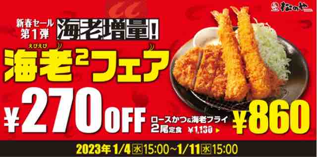 とんかつ専門店の松のや・松乃家で、新春セール第1弾として、お値段変わらずに海老フライを1本増量できる海老えびフェアを開催する。「ロースかつ&海老フライ2尾定食」がお値段変わらずに海老フライを1本増量となり、1,130円のところ270円引きの860円となる。