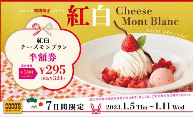 ファミリーレストランのココスで、期間限定スイーツ「紅白チーズモンブラン」が登場。新年のお祝いにぴったりな期間限定スイーツが半額になる。