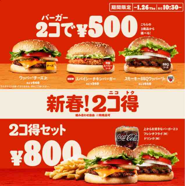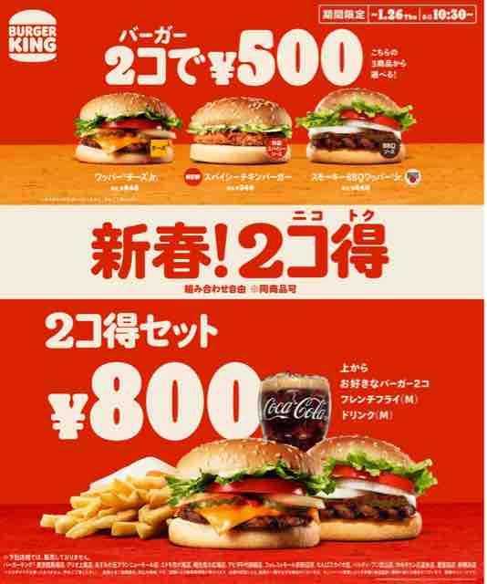 ハンバーガーチェーン店のバーガーキングで、2023年新春のお得なキャンペーンとして2コ得(ニコトク)で対象のバーガーが2コで500円になる。