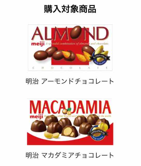 無料引換券がもらえる対象の商品は「明治 アーモンドチョコレート」または「明治 マカダミアチョコレート」。
