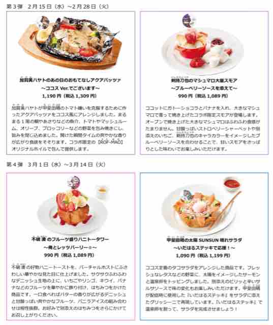ココスでキャンペーン期間中、限定のコラボメニューが発売される。キャンペーン対象メニュー1品の注文につき、クリアファイルが1枚もらえる。クリアファイルは各弾でデザインが変わる。