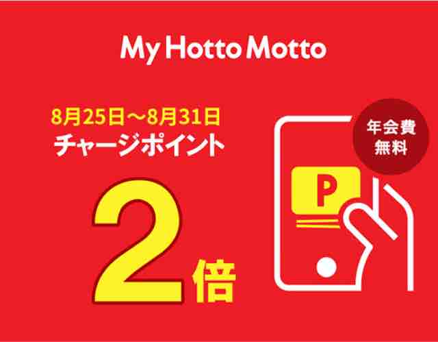 ほっともっとのチャージポイントが2倍もらえるキャンペーンは毎月25日~月末の期間で実施されるのが恒例になっている。My Hotto Mottoの会員になればチャージできる。年会費無料なのでおススメしたい。これまでチャージポイント5倍キャンペーンも実施されたことがあるが、2倍でもお得である。