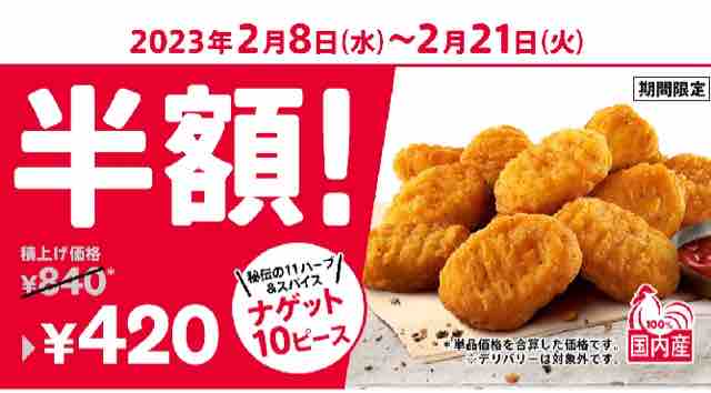 このキャンペーンは、店内でも持ち帰りでも、ナゲット10ピースが半額になるのが嬉しい。ただ、デリバリーは対象外となる。サイドメニューという位置づけなので、他のメニューと組み合わせて買うことをおススメしたい。