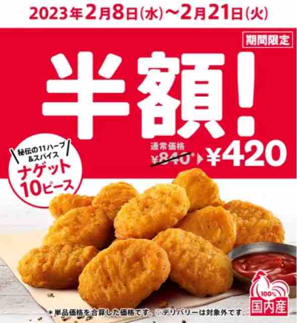 ナゲット10ピースは通常価格840円(税込)のため、半額の420円(税込)で提供されるのはお得だ。今回は、ケンタッキーで実施されているナゲット10ピースが半額のキャンペーンを紹介していきたい。