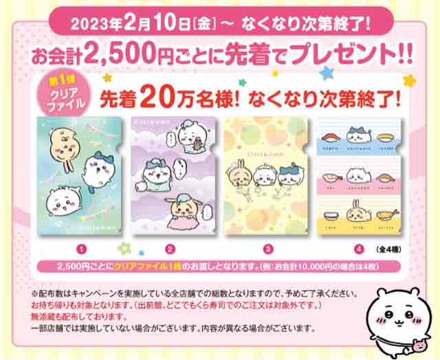 回転寿司チェーン店のくら寿司で、ちいかわとのコラボキャンペーンが始まっている。キャンペーン第1弾はお会計2,500円以上(税込)購入で、ちいかわのクリアファイル全4種のうち、1枚をもらうことができる。先着20万名様にプレゼントで早い者勝ちとなる。