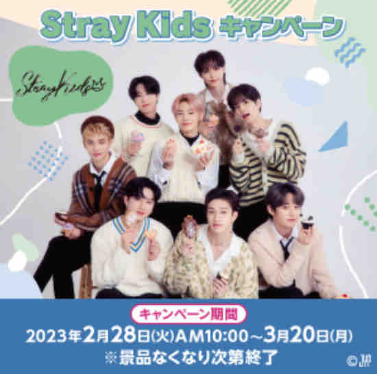 Stray KidsはMnetのサバイバルオーディション番組で結成された。キャンペーンは対象商品を買うと、キャンペーン限定オリジナルクリアファイル全5種のうち1枚がその場でもらえる。
