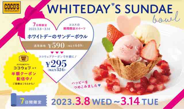 ファミリーレストランのココスで、期間限定スイーツ「ホワイトデーのサンデーボウル」が登場。ホワイトデーにぴったりな期間限定スイーツが半額になる。