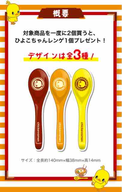 チキンラーメンオリジナルひよこちゃんレンゲは、全3種で各店先着24個(各8個)用意されている。チキンラーメンのキャラクターひよこちゃんは可愛いと人気があり、これまで実施されてきたおまけキャンペーンは好評だった。