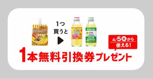 無料引換券がもらえる購入対象商品は、「まるでスムージーバナナ&フルーツミックス味 150g」で1本買うと無料引換券がもらえる。もらえる無料引換券の対象商品は「C1000ビタミンレモン コラーゲン 140ML」「C1000ビタミンレモン クエン酸 140ML」どちらか1本。