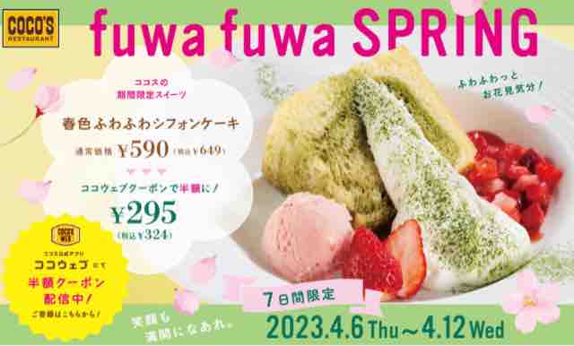 春にぴったりな期間限定スイーツとして、「春色ふわふわシフォンケーキ」がココウェブで半額で提供されるキャンペーン。ココスでは期間限定スイーツが半額で提供されるのが恒例だ。お得で楽しめるスイーツ。この期間でしか味わえないスイーツを楽しみたいところだ。
