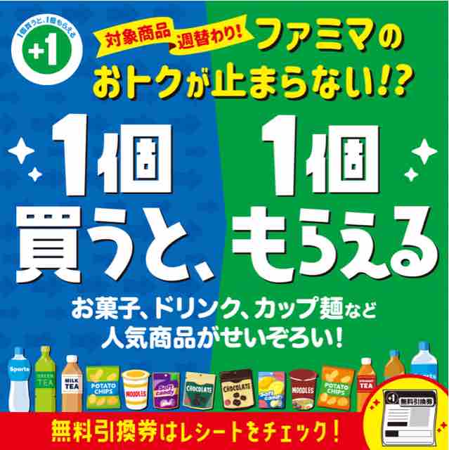 コンビニエンスストアのファミリーマートで、対象商品を買うと同メーカー商品の無料引換券がもらえるキャンペーンが始まっている。週替わりで多数の商品が対象になっている。