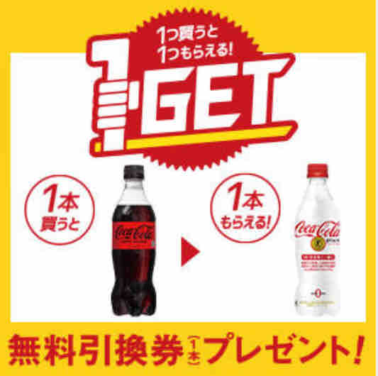 「コカ・コーラ500ml」を1本買うと、「コカ・コーラ プラス470ml」1本の無料引換券をもれなくもらえる。ドリンク無料券引換券は、対象商品1個購入につき1枚発行される。