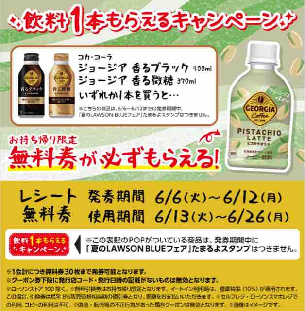 コンビニエンスストアのローソンで、対象の「コカ・コーラ ジョージア 香る微糖 370ml」または「コカ・コーラ ジョージア 香るブラック 400ml」を1本買うと、「コカ・コーラ ジョージア ピスタチオラテ 280ml」の無料引換券がレシートクーポンで